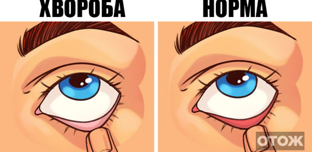 Стоячи перед дзеркалом, відтягніть нижню повіку. У нормі її колір яскраво-рожевий. Однак при анемії внутрішня повіка має блідо-рожевий або навіть жовтуватий відтінок. Анемія виникає від нестачі гемоглобіну. М’язи й тканини організму отримують мало кисню і не можуть працювати на всі 100%. Якщо ви помітили у себе блідість, підвищену стомлюваність або задишку, то краще здати аналізи й визначити рівень заліза в крові.