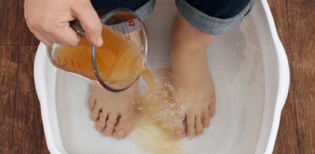 Змішайте 1:1 яблучний оцет з водою, занурте туди ступні ніг й пальців у цей розчин та тримайте 30 хвилин. Далі просто дістаньте з розчину ноги та просушіть на повітрі.